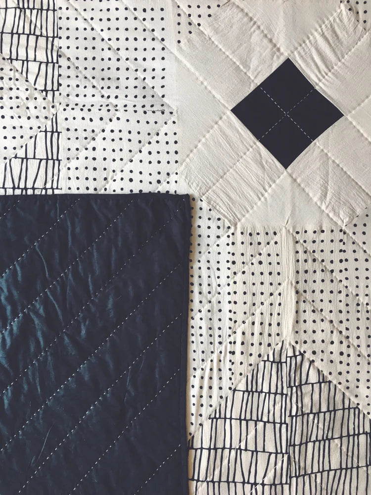 Crafted in collaboration with Vacilando Studios, this modern quilt is made in the USA from our saved natural flour sack cotton scraps collected throughout the year. Each piece is screen printed with non-toxic ink, then machine pieced and quilted by Vacilando’s U.S.-based artisans. Designed to be both functional and enduring, the quilt features a soft off-white bone tone with a solid black backside and contrast stitching. Made to order with intention from start to finish.